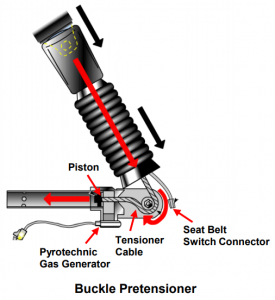 A pretensioner is a device that is connected to the safety belt buckle, safety belt retractor or/and outboard lower safety belt anchor assembly. The pretensioner tightens the seat belt during certain crashes. Pretensioners may deploy with or without airbag deployment. Depending upon the vehicle, pretensioners may activate in certain frontal, side, rear and/or rollover crashes. For some vehicles, pretensioners will deploy if the safety belt is buckled.